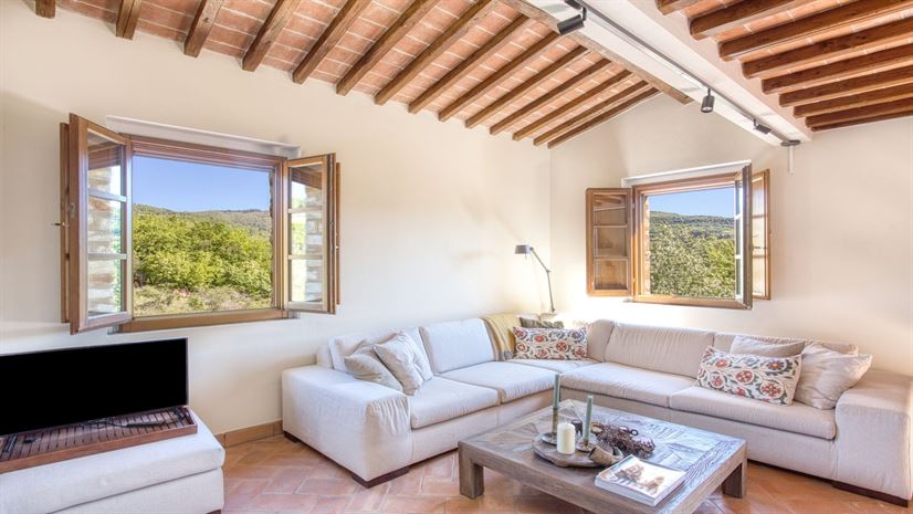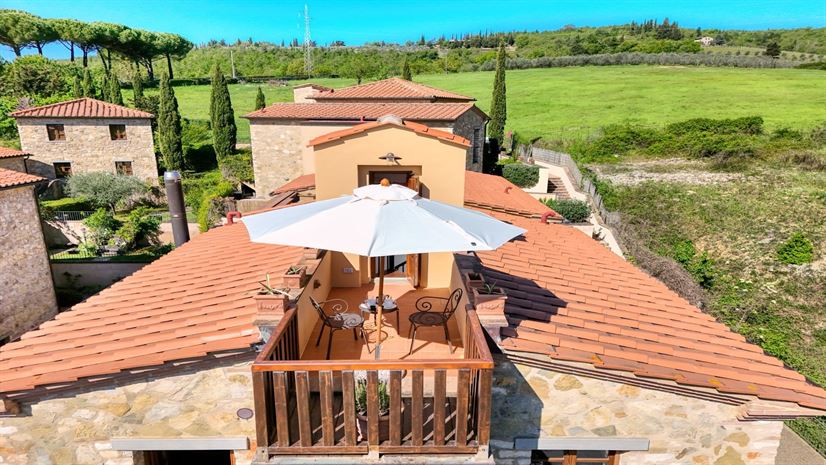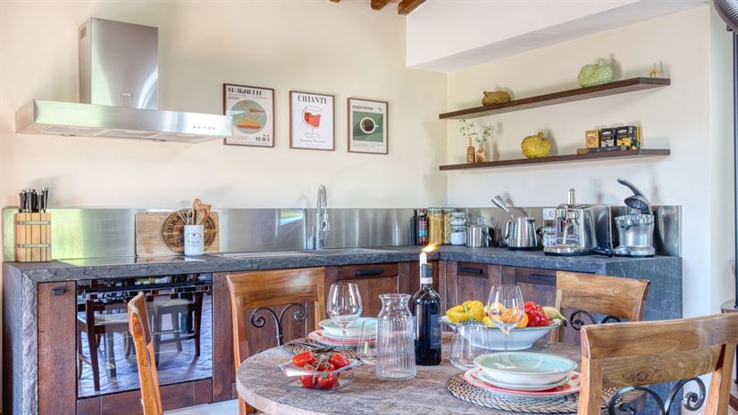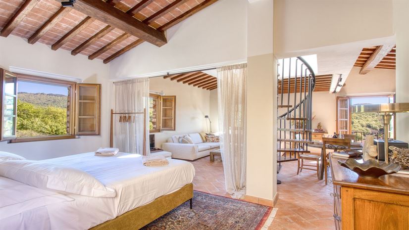 Balconcino is a spacious third-floor studio apartment with private external access, featuring traditional wooden-beamed ceilings and terracotta floors. Comfortably furnished throughout, it offers a warm and inviting atmosphere. The sun-filled roof terrace on the top floor is perfect for romantic sunset dinners and enjoys sweeping views over Gaiole and the rolling Chianti hills.