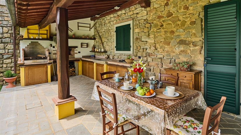 La maison de plain-pied est construite en pierre naturelle, avec des volets en bois vert foncé. À l’avant se trouve une terrasse couverte avec une cuisine extérieure bien équipée, comprenant un barbecue et un four à pizza traditionnel, ainsi qu’un coin salon et une table à manger. Le jardin offre de belles pelouses soignées et une piscine élégante.