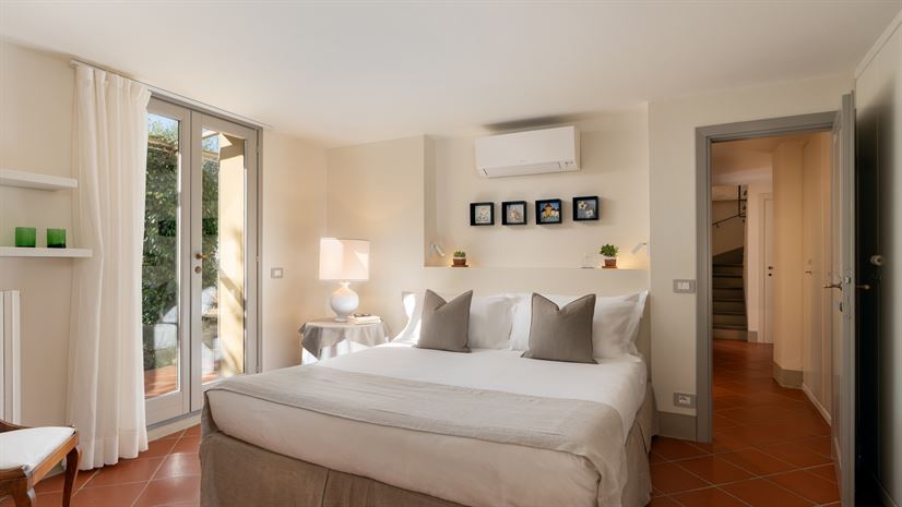Double bed (cannot be converted to twin), bedside tables, wardrobe, chair, air-conditioning, French doors leading to the garden.