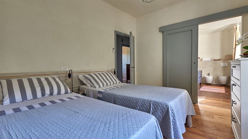 Lits jumeaux (peuvent être convertis en lit double), tables de chevet, commode, chaise, armoire encastrée, climatisation.