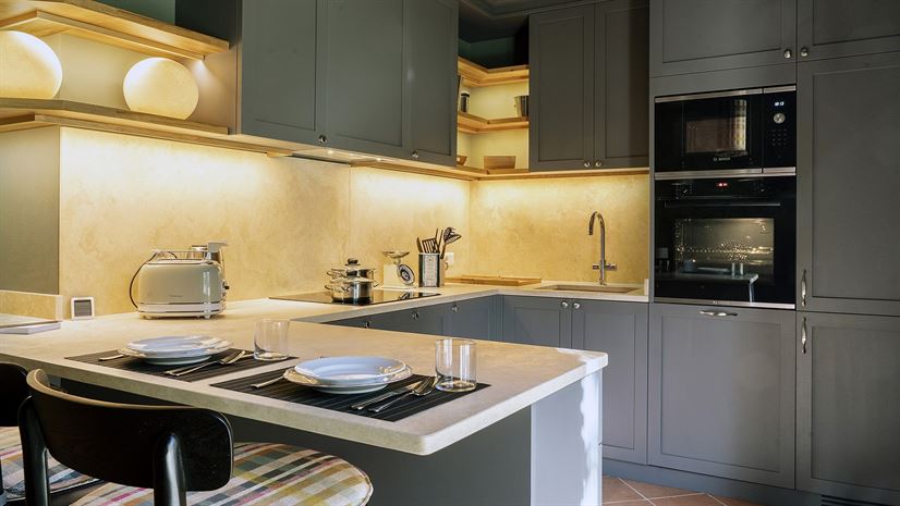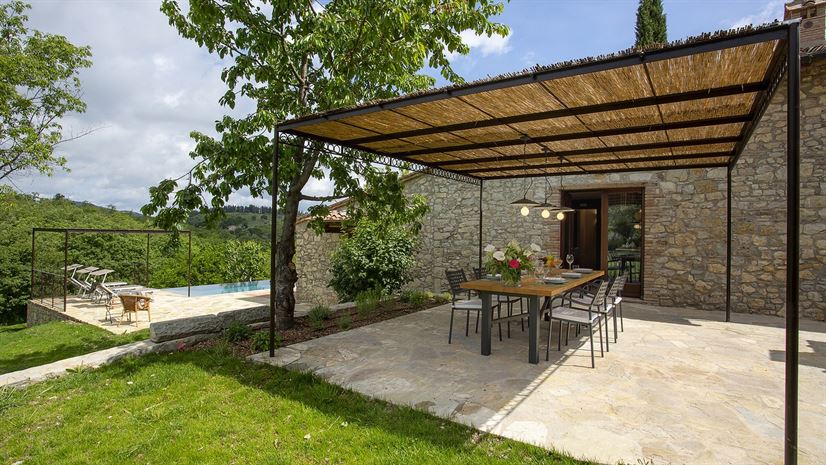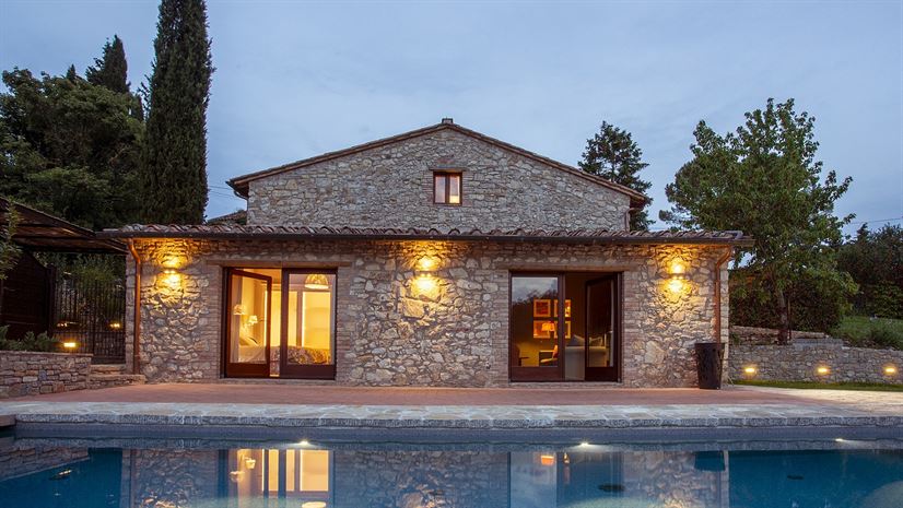 Built from local stone, Casa Pernice boasts covered pergolas, a pizza oven and a beautiful landscaped garden. A heatable infinity pool, just three metres from the villa, forms the focal point of the outdoor space, offering the perfect setting to relax and enjoy views stretching from the garden to the surrounding forest.