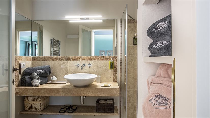 The two-storey villa has been carefully restored with exceptional attention to detail. Large Fench doors allow natural light to flow throughout the interiors, enhancing the welcoming atmosphere. Modern furnishings have been thoughtfully selected with guest comfort in mind, while plush towels and bathrobes add a touch of elegance. The ground-floor master bedroom offers direct access to the pool area, and the first-floor bedroom features a private balcony, providing an ideal spot to relax and enjoy the view.