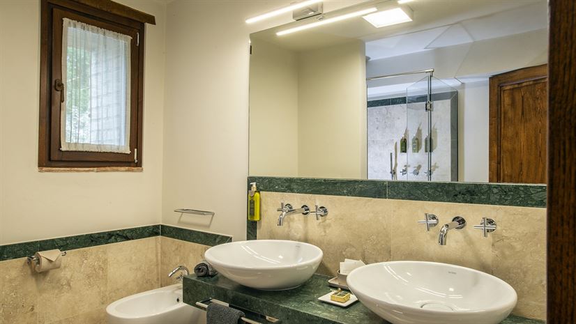 Shower, double sink, bidet, WC.