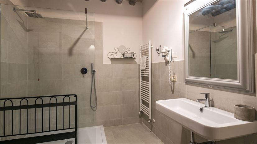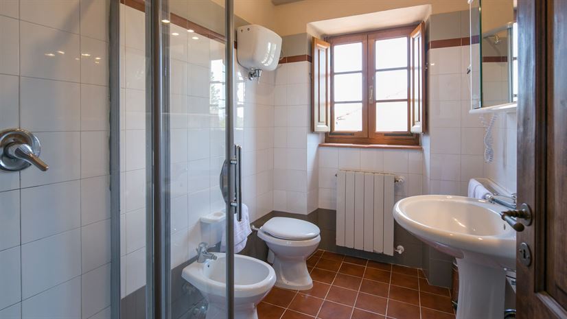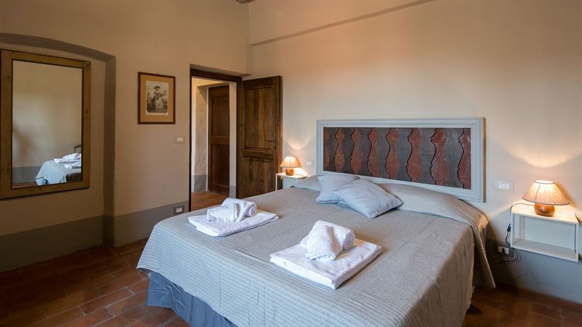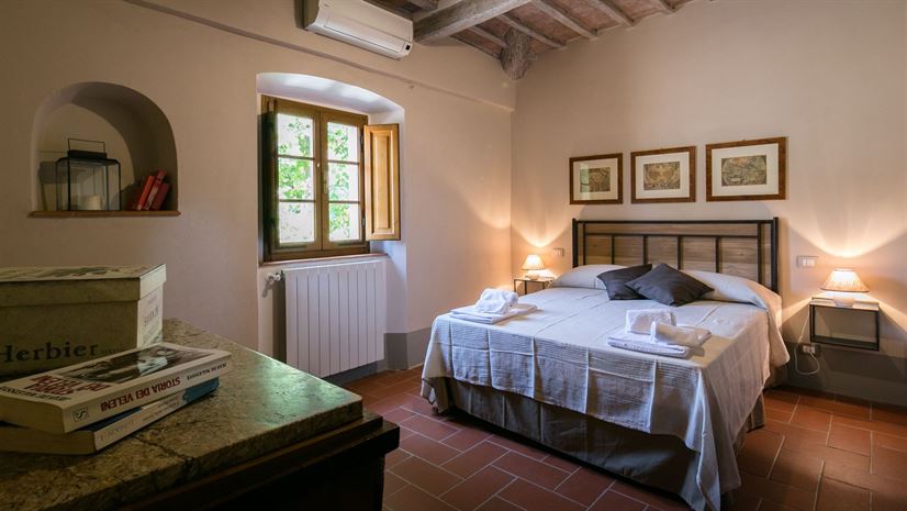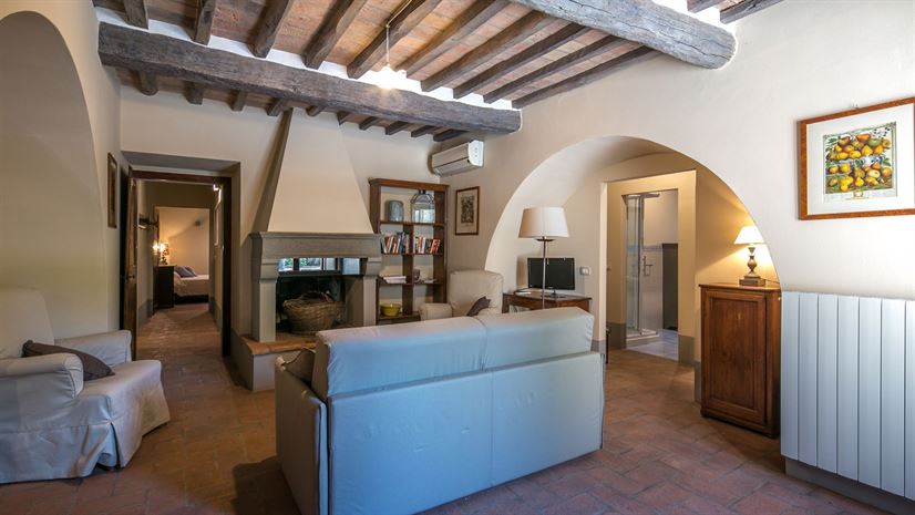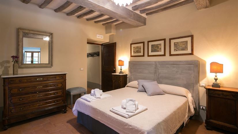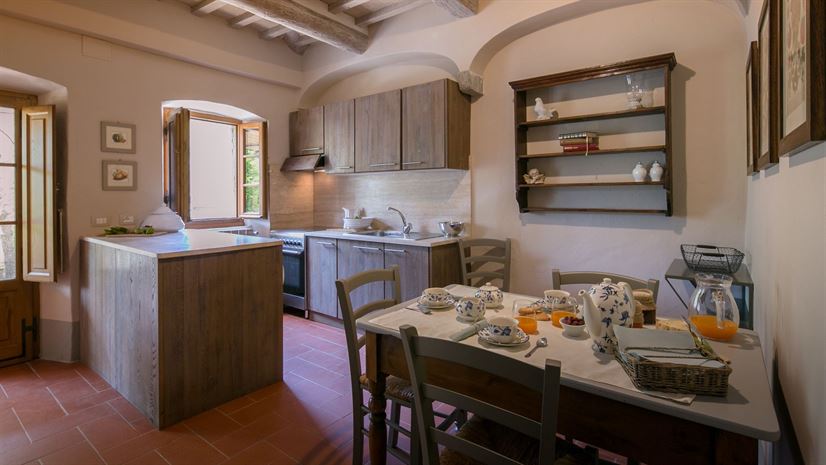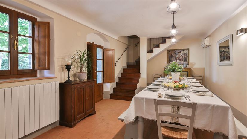 À l’intérieur, la maison a été restaurée avec soin, préservant les éléments typiques de l’architecture toscane, tels que les poutres apparentes et les sols en terre cuite. Les murs aux tons neutres créent une atmosphère chaleureuse et accueillante. La grande cuisine avec coin repas donne directement sur la terrasse. Pour les hôtes en quête de davantage d’intimité, deux appartements indépendants avec cuisine et coin repas sont accessibles par un escalier extérieur en pierre situé sur le côté de la villa.