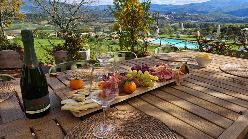 On ne peut pas visiter la Toscane sans parler de la gastronomie, et nos propriétaires nous ont gâtés, comme toujours. À la Tenuta Seriole 10, l'équipe a pu déguster des fromages locaux, du jambon, du pain frais, des fruits et du vin mousseux provenant d'un vignoble voisin, ainsi que des vins de Casanova di Bricciano et Casale San Vincenti, deux villas très spéciales.