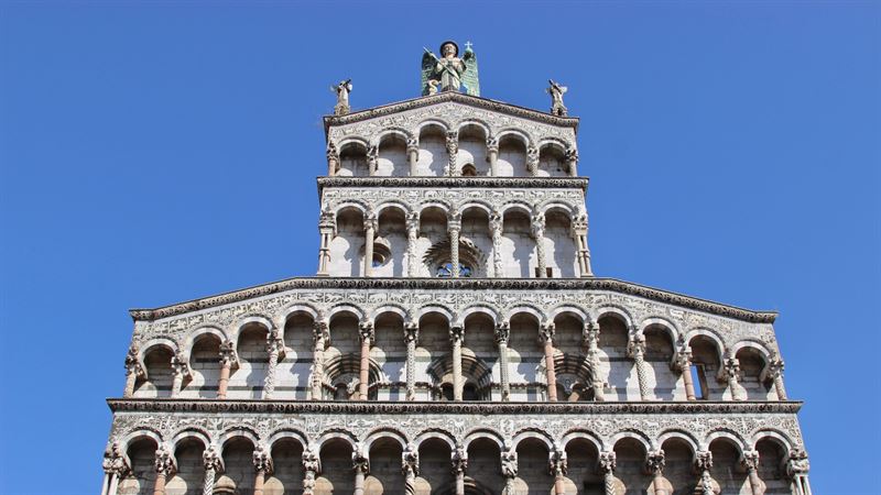 En vous dirigeant au nord en sortant de la Piazza del Duomo, vous arriverez à la Piazza San Michele, entourée d’arcades datant de la Renaissance. Au centre de la place, l’Église San Michele in Foro, construite sur le site de l’ancien forum romain, est sans aucun doute la façade de style pisan-roman la plus spectaculaire d’Italie. Pise était la référence majeure dans la région par ses es liens commerciaux avec l’Espagne et l’Afrique du Nord, expliquent le penchant de la ville pour les motifs en architecture, copiant les carrelages et les textiles maures. L’influence orientale s’étendit ainsi de Pise jusqu’à Lucques. Les plus belles églises de style pisan-roman disposent de façades ornées de marbre vert, gris et blanc. Dans le cas de ce chef d’œuvre de la ville, le style ciselé des délicates colonnades vient mettre en exergue la hauteur et l’exubérance de cette façade. Flanquées du plus joli clocher de tout Lucques, les arcades sont ornées de délicats motifs et d’allégories. Gravées dans le marbre vert et blanc, vous y verrez des scènes de chasse avec des bêtes exotiques, telles que des ours, des dragons et des éléphants, rencontrant des animaux beaucoup plus autochtones tels que le lapin, un canard et un corbeau picorant des raisins. L’Église est surmontée d’une immense statue dorée de l’Archange Michel entouré de deux anges, tuant un dragon.