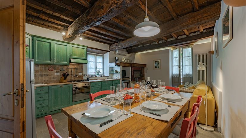 Canapé, table de salle à manger et chaises, cuisine entièrement équipée, cheminée, porte s’ouvrant sur la loggia, climatization.