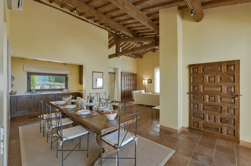 À l’intérieur, la maison combine des éléments traditionnels toscans, comme des plafonds à poutres apparentes et des sols en terre cuite, avec un mobilier moderne et confortable. Un décor clair et de grandes fenêtres créent une atmosphère lumineuse et accueillante.