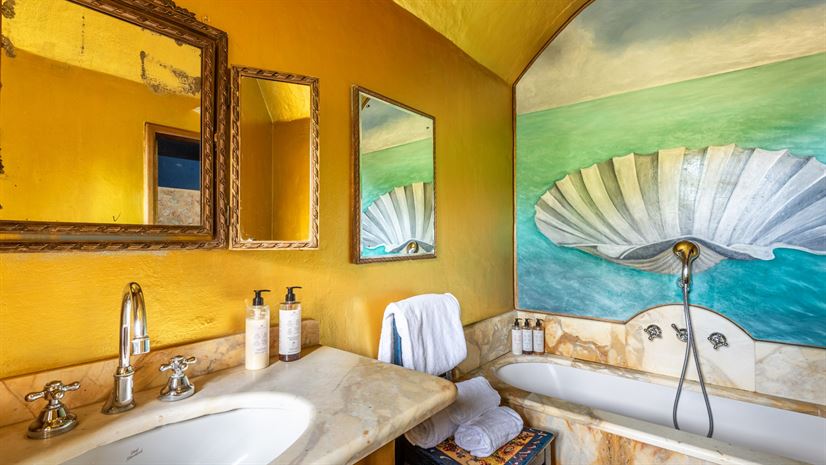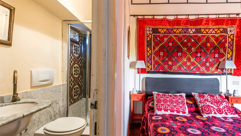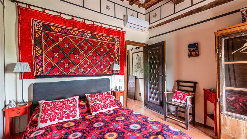 À l’intérieur, des espaces colorés aux sols en terre cuite, aux plafonds à poutres apparentes et au mobilier élégant créent une atmosphère chaleureuse et accueillante.