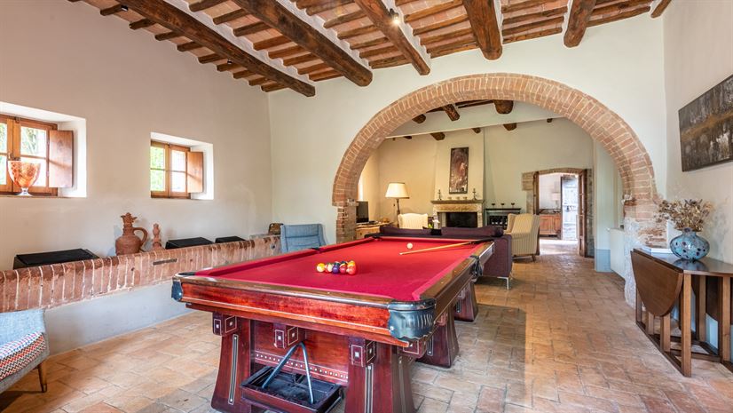 Table de billard, canapé, fauteuils, table basse, cheminée (décorative), portes vers la terrasse avec mobilier de jardin.