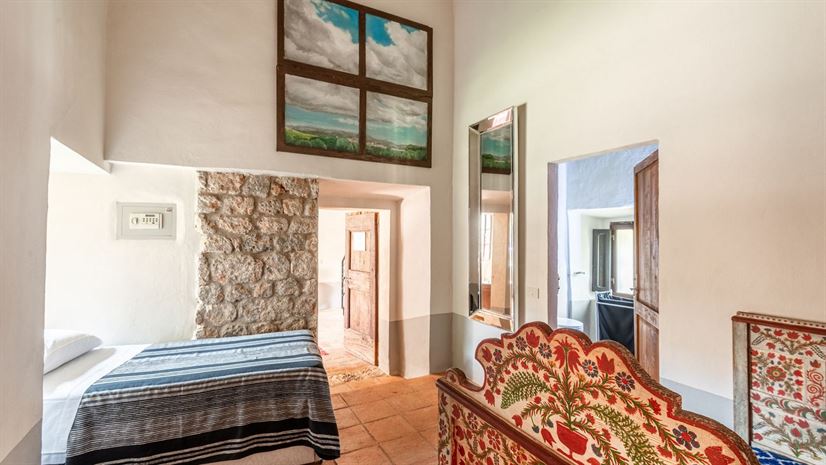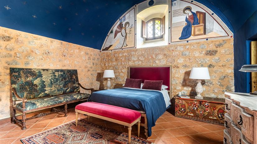 Lit double 180 × 195 cm (peut être converti en lits jumeaux), tables de chevet, commode, armoire, fauteuils, cheminée décorative, climatisation.