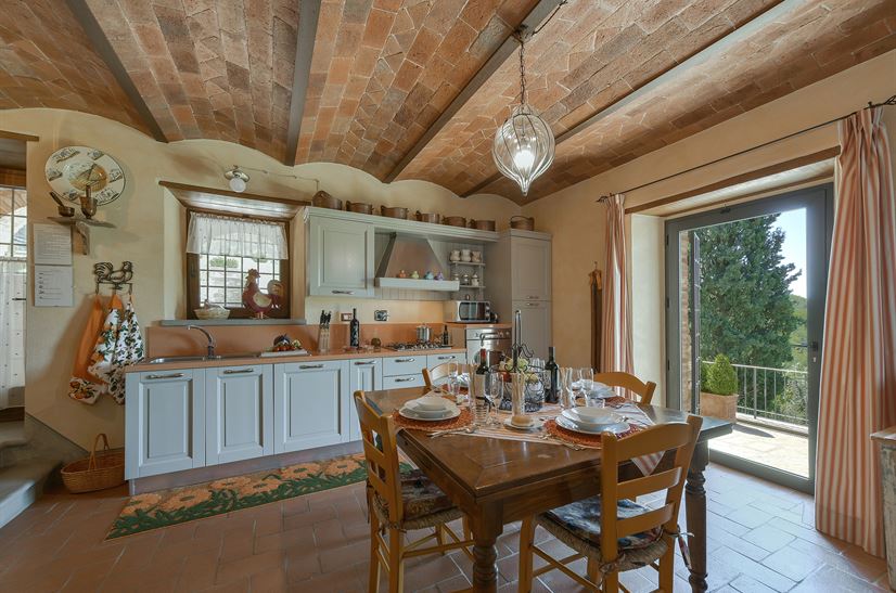 Répartie sur trois étages, la maison présente des éléments typiques de la Toscane, tels que des plafonds voûtés, des poutres apparentes et des sols en terre cuite, associés à un mobilier confortable et soigné, riche en détails personnels.
