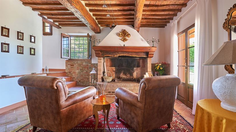 À l’intérieur, la villa à deux étages a été restaurée avec soin. De hauts plafonds à poutres apparentes, des sols en terre cuite et de grandes cheminées soulignent l’authenticité du lieu. Le mobilier associe pièces contemporaines de qualité et meubles anciens sélectionnés avec goût, créant une atmosphère élégante et chaleureuse.