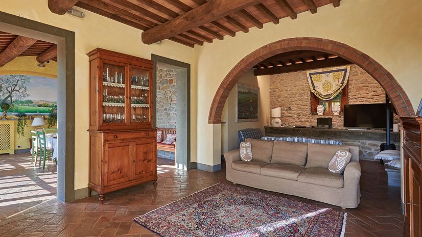À l’intérieur, la maison reflète le style toscan classique. Les sols en terre cuite, les poutres apparentes et le mobilier soigneusement choisi créent une atmosphère chaleureuse et authentique. Les pièces de vie s’ouvrent directement sur les terrasses pour une harmonie parfaite entre intérieur et extérieur. La traditionnelle Limonaia, autrefois utilisée pour abriter les citronniers en hiver, sert aujourd’hui de deuxième salle à manger, baignée de lumière et imprégnée de charme toscan.