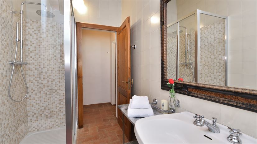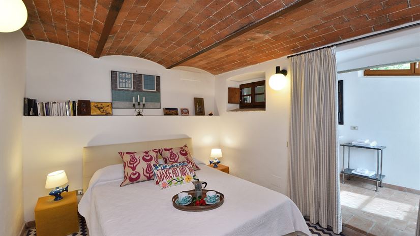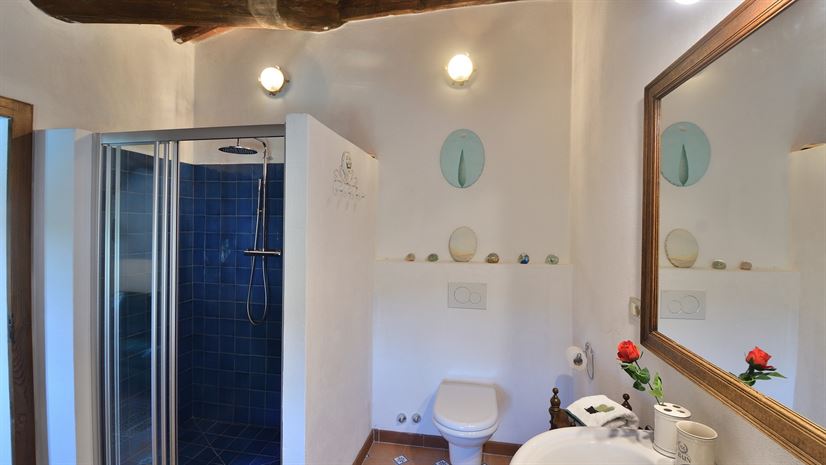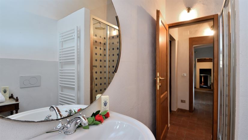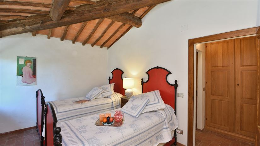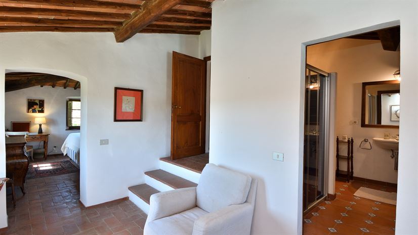 La cuisine s’ouvre directement sur la salle à manger et les séjours extérieurs qui comportent deux zones de repas meublées et ombragées, un grill extérieur avec l’ancien four à pain de la ferme désormais utilisé pour faire des pizzas : c’est là le cadre parfait pour profiter d’un festin en extérieur. Le vaste terrain fait partie d’un domaine privé de 14 hectares qui assure paix et sérénité à votre séjour. La piscine luxuriante est entourée d’arbres fruitiers et bénéficie de vastes vues inoubliables sur la vallée. Détendez-vous près de la piscine sur une chaise longue, à l’abri de la pergola, avec un bon livre et un verre de Chianti pour vivre le rêve toscan.