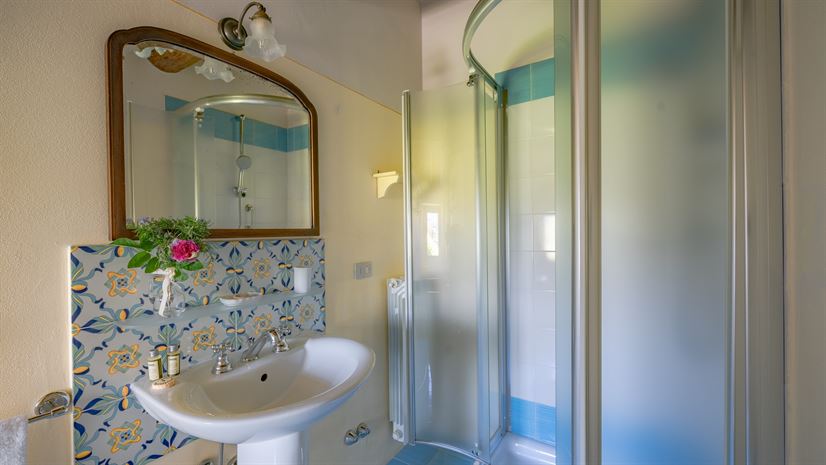 À l’extérieur, le grand jardin avec ses arbres matures, ses terrasses aménagées et sa piscine invite à la détente. L’intérieur mêle éléments toscans traditionnels et décoration élégante aux tons doux.