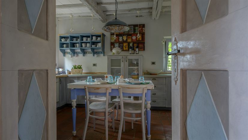 À l’intérieur, on découvre des éléments typiques toscans : sols en terre cuite, plafonds à poutres apparentes et cheminées généreuses. Le mobilier élégant, de grande qualité, ainsi que les détails décoratifs renforcent une atmosphère chaleureuse dans des pièces spacieuses et pleines de caractère.